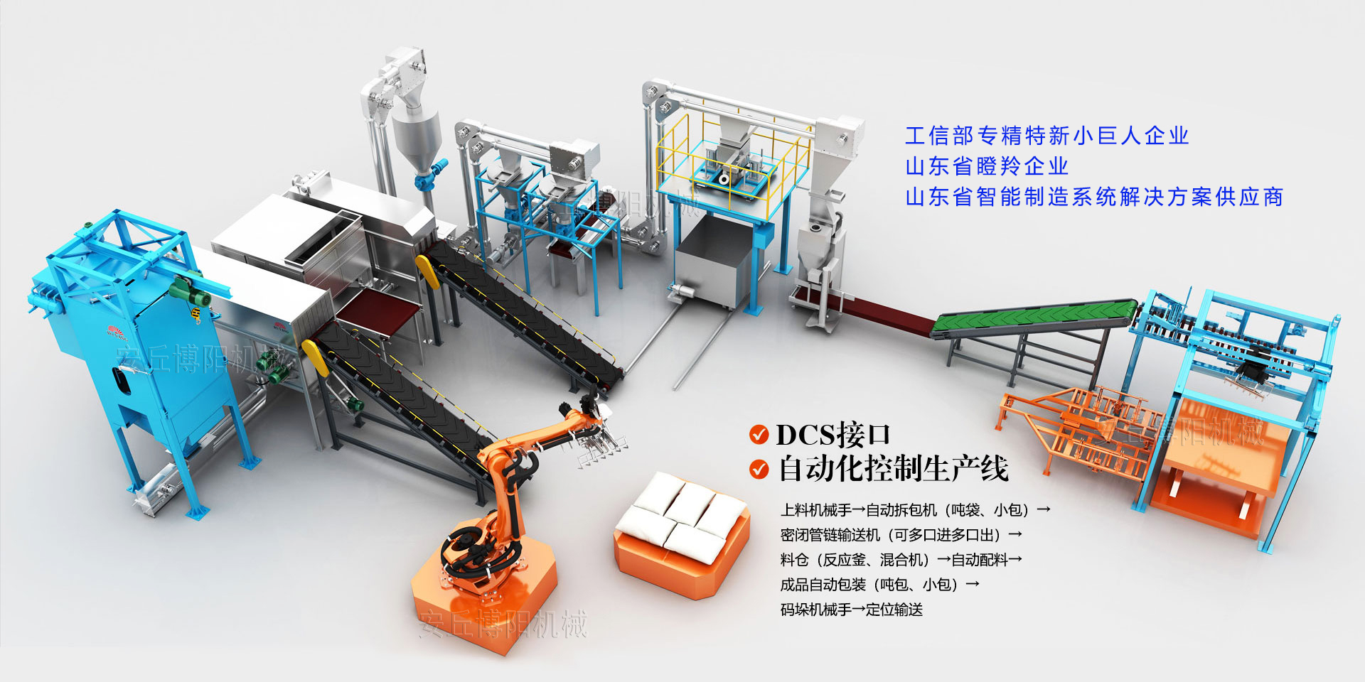 安丘博陽機械制造有限公司成立于2008年,是一家專注于自動化包裝、碼垛、拆垛拆包投料及智能倉儲物流裝備定制的研發型“生產+服務”企業,業務包括包裝碼垛生產線、拆垛拆包投料生產線、AGV搬運立體庫倉儲生產線、智能裝卸車生產線制造和提供制造業生產線工業4.0升級改造服務等5大板塊,涵蓋化工、醫藥、農藥、化肥、鹽堿、新能源、新材料、有色金屬、橡膠、塑料、食品、礦山、建材、危廢、鋁電二十多個行業。是中鋁集團、中國水電集團、北方稀土集團、華友控股集團、兗礦集團等國內頭部企業優質合作伙伴。
